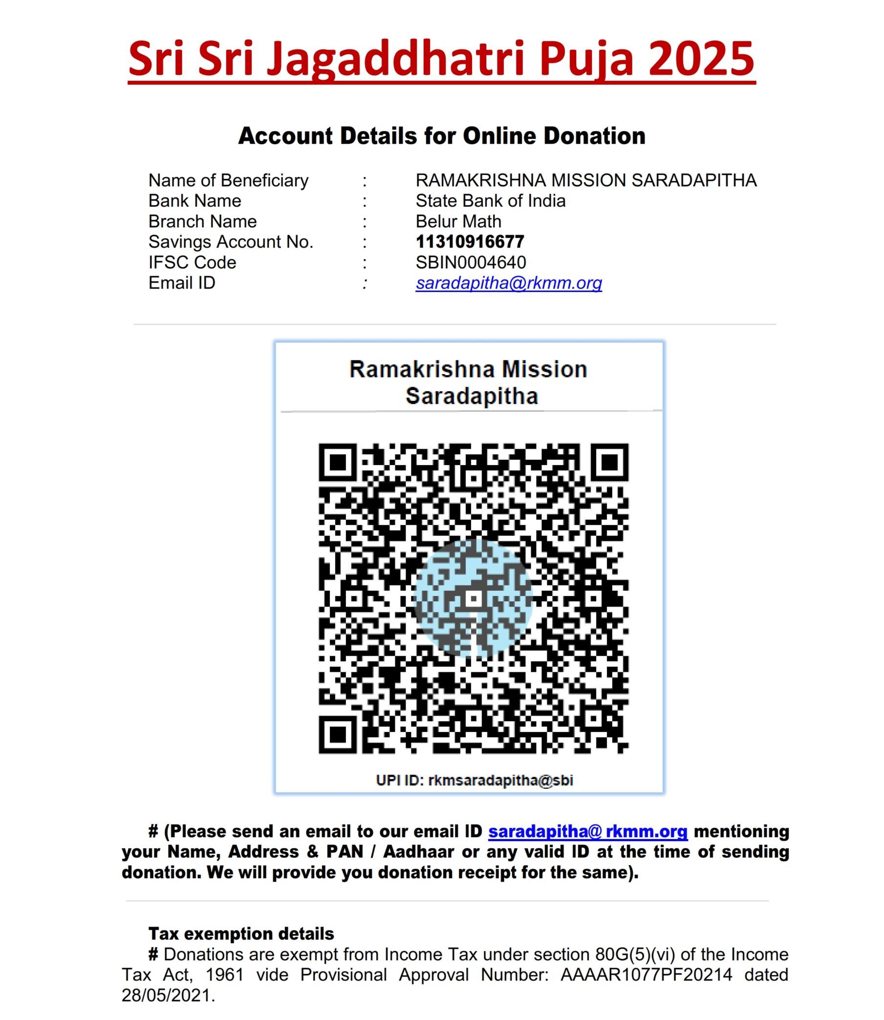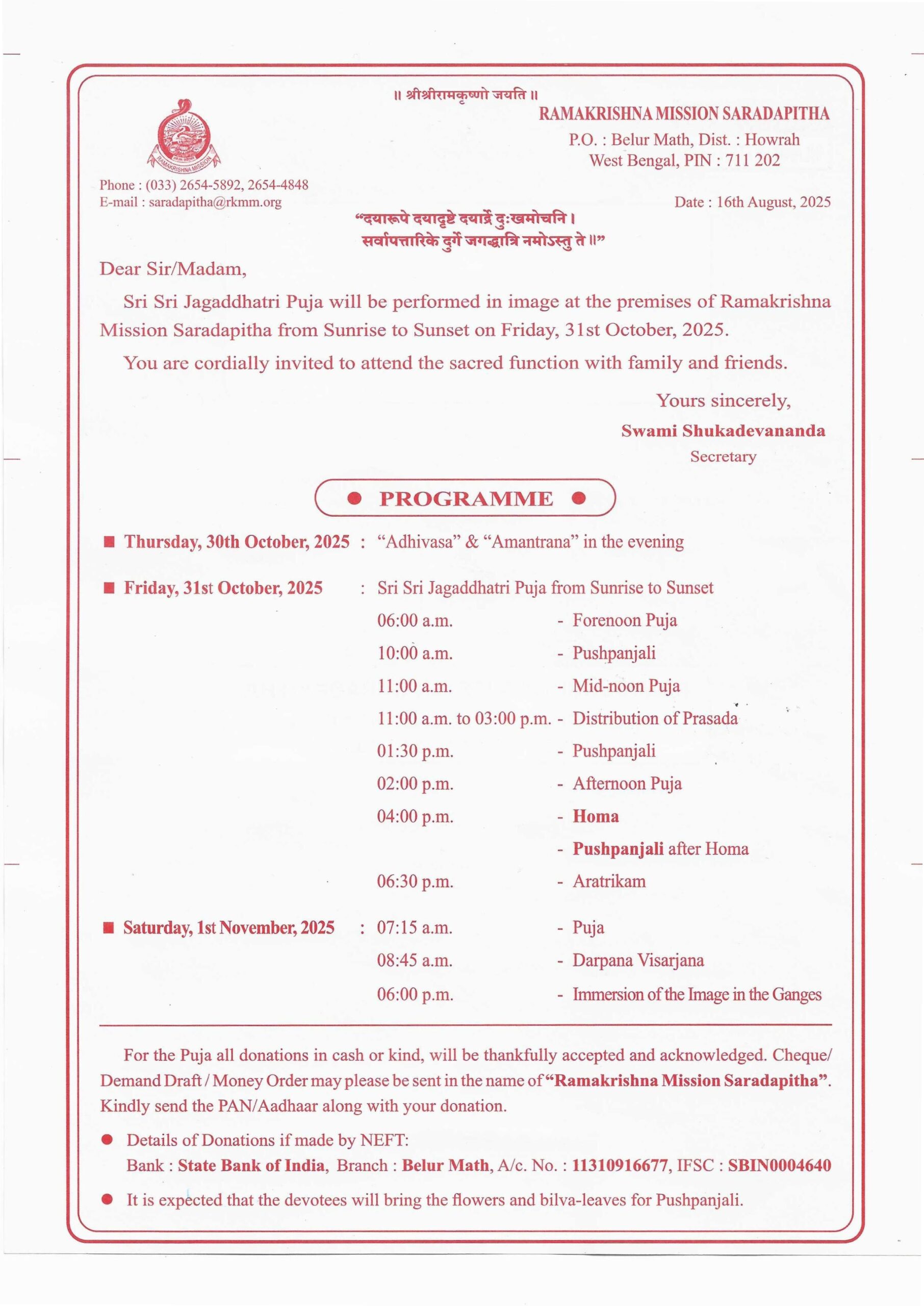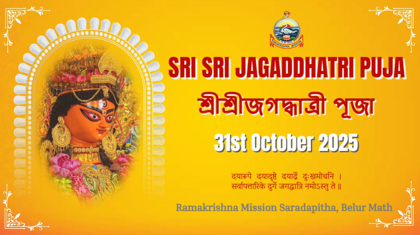 The worship of the Divine Mother Sri Sri Jagaddhatri will be performed at Ramakrishna Mission Saradapitha, Belur Math on 31st October 2025. All are cordially invited to attend the sacred function.